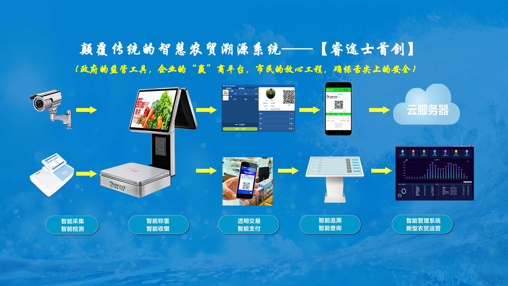 睿途士顛覆傳統(tǒng)的智慧農(nóng)貿(mào)溯源系統(tǒng),創(chuàng)新實(shí)現(xiàn)了【智慧農(nóng)貿(mào)溯源管理系統(tǒng)】與【智能稱重收銀】 一體化解決方案,集市場監(jiān)管、市場管理、運(yùn)營管理、智能收銀、 溯源追溯、線上買菜、大數(shù)據(jù)運(yùn)用于一體,硬件、軟件與管理系統(tǒng)完美結(jié)合。